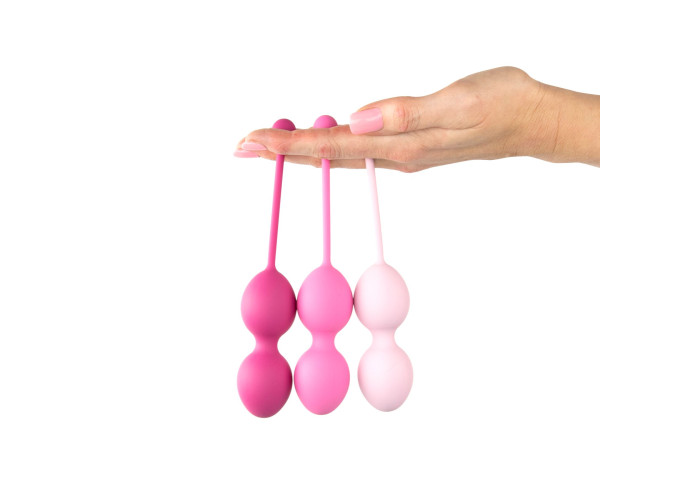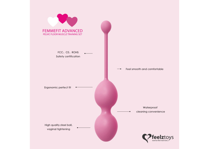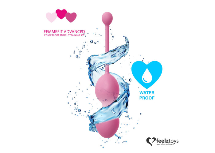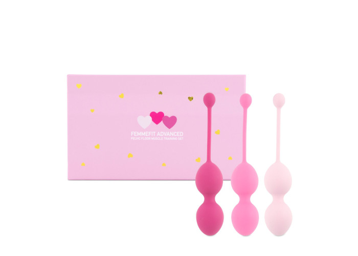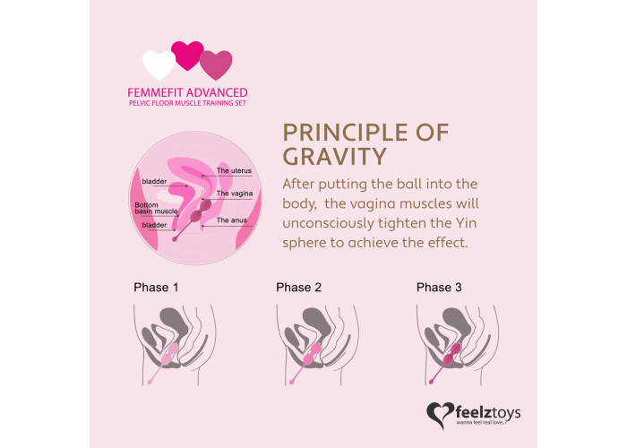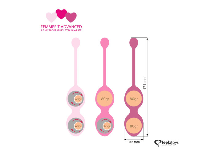 Набір важких вагінальних кульок для просунутих FeelzToys - FemmeFit Advanced Pelvic Muscle Training Set створений спеціально для жінок, які давно практикують тренування м'язів тазового дна і хочуть досягти максимальних результатів. У набір входить три подвійних кульки, в більш легких — одна або дві кульки, що перекочуються всередині та забезпечують додаткову стимуляцію під час занять і підвищують їх ефективність.