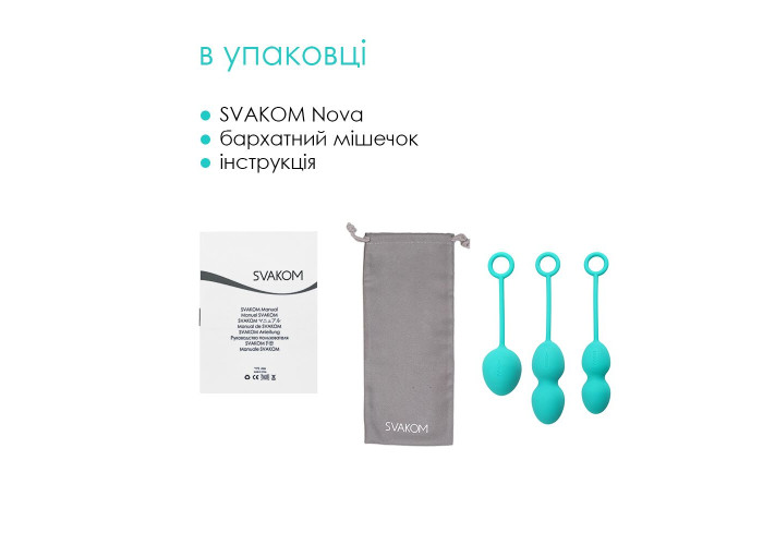 Усі вагінальні кульки Svakom покриті безпечним силіконом та оснащені петелькою для вилучення. Тренуючись із набором вагінальних кульок зі зміщеним центром ваги Svakom Nova, вже за кілька місяців ви помітите реальні зміни!