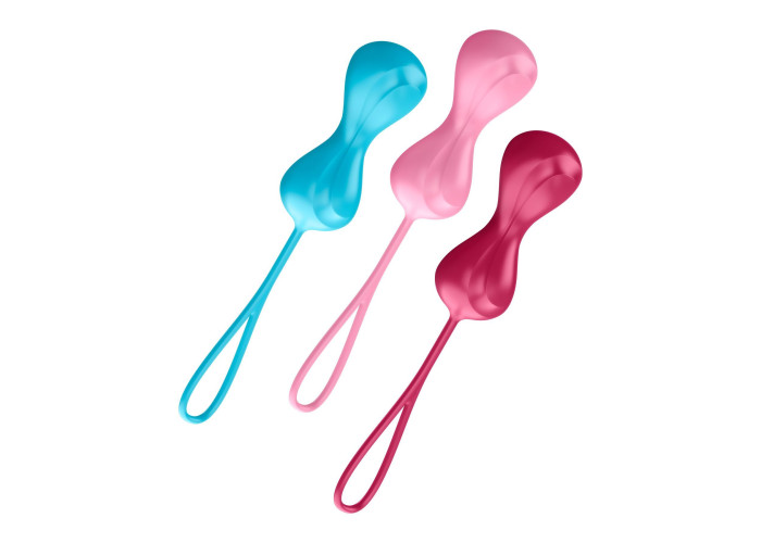Пропонуємо купити вагінальні кульки Satisfyer balls training set з рухомими тягарцями всередині - це стартовий набір вагінальних кульок вагою від 60 до 91,6 грам, який допоможе ефективно тренувати вагінальні м'язи, щоб поліпшити і якість сексу, і жіноче здоров'я. В набір входить 3 подвійних кульки незвичайної форми з петлями для безпечного витягання.