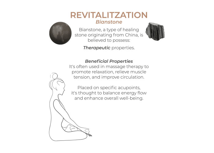 Камінь Бянь — глибокого чорного кольору, відповідає за кровообіг. Цей китайський камінь використовується в масажній терапії для релаксації, зняття м’язового напруження та поліпшення кровообігу. Маса 38 г.