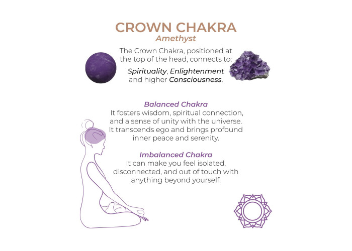 Аметист — насичено фіолетовий, різних відтінків. Він пов’язаний із духовністю, просвітленням та вищою свідомістю, відповідає за коронну чакру. Сприяє розвитку мудрості, духовного зв’язку та відчуттю єдності зі всесвітом. Маса 37 г.
