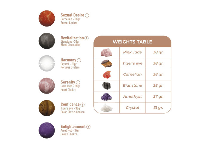 Ви можете використовувати одну кульку або дві одразу, комбінувати їх з урахуванням маси та властивостей каміння — у такий спосіб ваші тренування будуть завжди різними і з фізичного, і з духовного погляду.