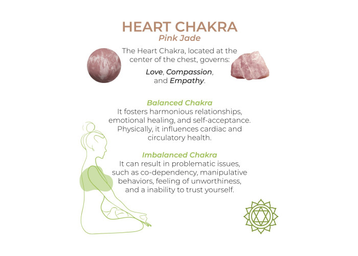 Рожевий нефрит — ніжно-рожевий, з легкими прожилками. Відповідає за серцеву чакру, що керує любов’ю, співчуттям та співпереживанням. Сприяє відчуттю внутрішнього спокою. Маса 38 г.