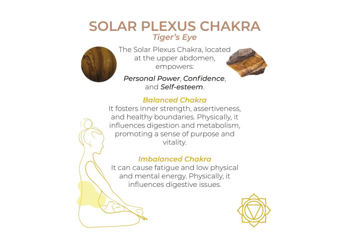 Тигрове око — переливчастий камінь, жовто-коричневий, до чорноти. Його чакра — чакра сонячного сплетіння. Робота над нею підвищує особисту силу, впевненість та самооцінку, поліпшує загальний обмін речовин. Маса 38 г.