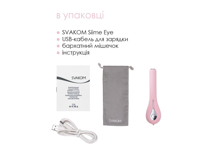У пакованні: SVAKOM Siime Eye + оксамитовий мішечок + інструкція + USB-кабель для заряджання.