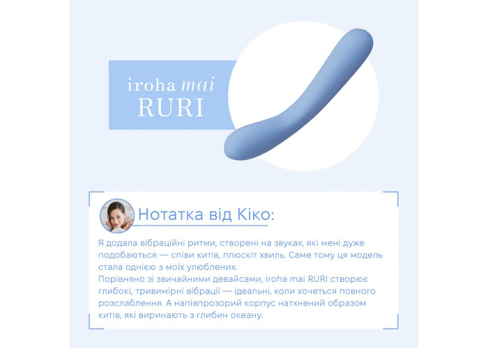 Звуковий вібратор IROHA MAI Ruri — це унікальна можливість з’єднатися з природою, відчути звуки моря всім тілом і віддатися хвилям неймовірної насолоди! Унікальна модель розроблена спільно з Кіко Мідзухара, а вібрації створені на реальних записах пісень китів. Це втілена пристрасть до моря, китів та глибокого задоволення. Такого ви не зустрінете більше в жодної іграшки у світі!