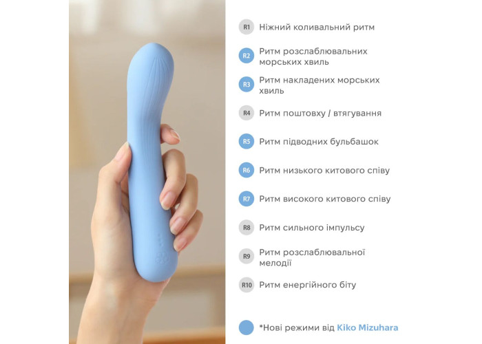 Відкрийте собі задоволення, яке буквально резонує з вами. Натхненний потужним і ласкавим морем, рухами та звуками природи, цей вібратор принесе ні з чим незрівнянне задоволення! Спеціальні режими вібрації були створені за допомогою адаптації реальних звуків, які Кіко Мідзухара записала під час плавання з китами, а також — заворожливих звуків хвиль.