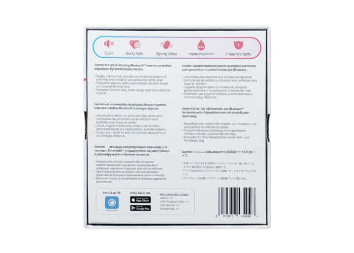 Якщо вам подобаються звичайні затискачі на соски, то наступний крок на вашому шляху задоволення — це смарт-вібратор для грудей Lovense Gemini. Налаштовуйте його максимально під свої бажання та отримуйте неймовірне задоволення в парі, самостійно або з партнером на будь-якій відстані.