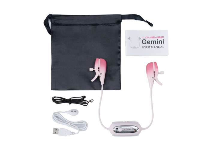 У комплекті зі смарт-вібратором для грудей Lovense Gemini ви отримаєте м’який мішечок для зберігання, шнурок для кріплення на шию, фіксатор для бюстгальтера, USB-кабель для заряджання та інструкцію. Будьте обережні, не залишайте затискачі на сосках за максимального тиску довше, ніж на 15–20 хвилин!