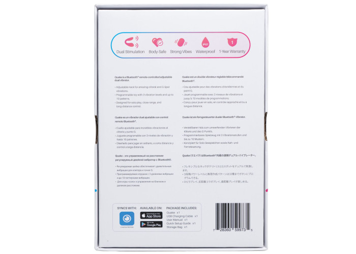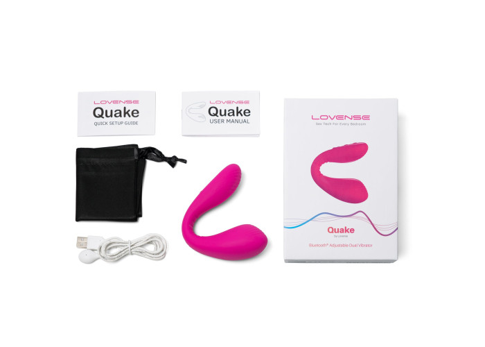 Зверніть увагу: при синхронізації зі смартфоном додаток бачить даний вібратор як Lovense Dolce. Справа в тому, що Lovense Quake - це перша лімітована серія даного вібратора! Надалі він буде випускатися під назвою Lovense Dolce при повністю ідентичному функціоналі. Подвійний смарт вібратор Lovense Dolce (Quake) повністю водонепроникний (IPX7), так що його можна взяти і в джакузі. Час роботи вібратора до 120 хвилин, час зарядки 70 хвилин (під час зарядки горітиме червоний індикатор, який згасне, коли вібратор зарядиться). У комплекті атласний чохол.