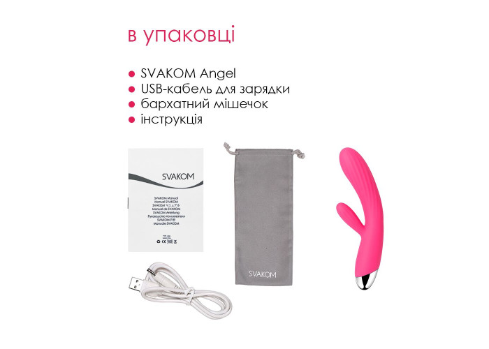 У пакованні: SVAKOM Angel + оксамитовий мішечок + інструкція + USB-кабель для заряджання.