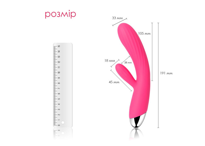 Розмір продукту: загальна довжина 191 мм; діаметр ввідної частини 33 мм; довжина ввідної частини 105 мм; довжина кліторального відростка 45 мм; діаметр кліторального відростка 18 мм; від відростка до відростка 28 мм.