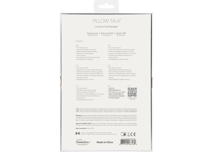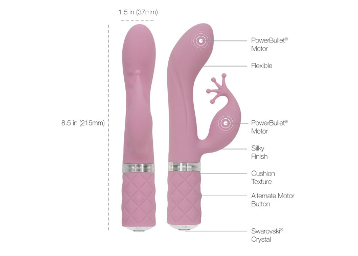 Пропонуємо купити розкішний вібратор PILLOW TALK - Kinky Pink - абсолютно надзвичайну модель з двома моторами, яка здатна здивувати навіть самих просунутих цінительок вібраторів. Короноподобний гнучкий відросток буквально охопить ваш клітор ласками з усіх боків, а загнутий кінець вводиться частини буде ніжно (або інтенсивно - як ви захочете!) Стимулювати точку G. І довершує розкішну картину справжній кристал Swarovski, розташований на рукоятці вібратора.