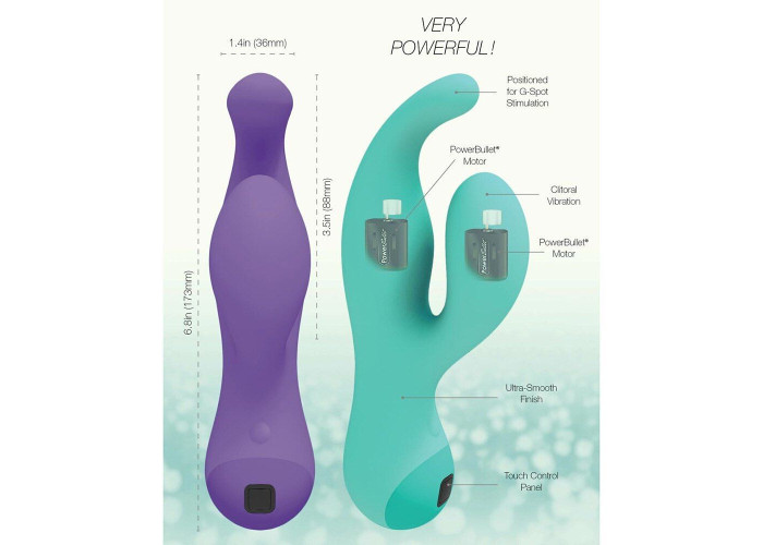 Незвичайний дизайн цього вібратора не просто радує око, він ретельно продуманий, щоб доставити максимальну насолоду. Щільний гнучкий відросток для стимуляції клітора плюс вводима частина особливої форми із загнутої головкою для стимуляції точки G створені для найприємніших відчуттів. Потовщення частини, що вводиться, забезпечує жінці почуття наповненості, а витончена голівка дражнить точку G своїми вібраціями. Відросток і головка можуть вібрувати як разом, так і окремо.