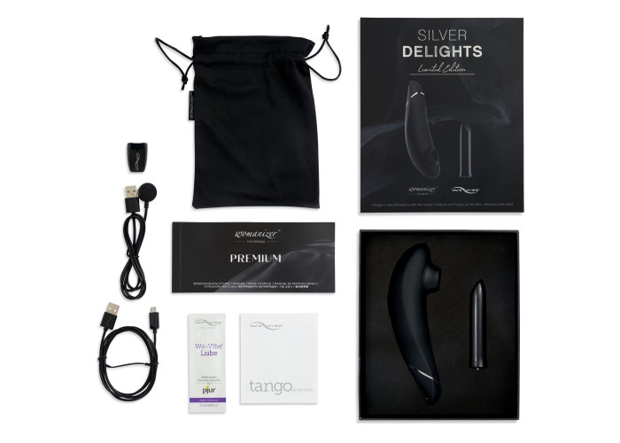 У комплекті: вакуумний кліторальний стимулятор Womanizer Premium, насадка на розтруб розміру М, віброкуля We-Vibe Tango, USB-кабель, магнітний USB-кабель, мішечок для зберігання іграшок, пробник лубриканту на водній основі We-Vibe Lube від pjur 2 мл, короткий посібник та інструкція з безпеки.