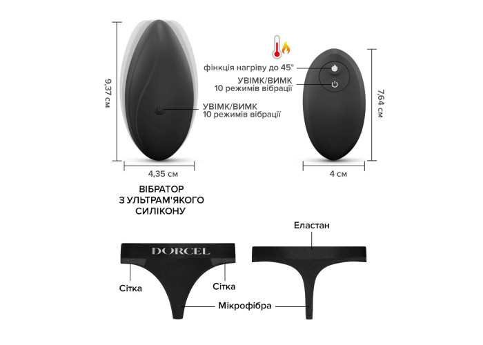 Наодинці чи разом із партнером, вдома чи на прогулянці — цей лагідний малюк завжди готовий вас порадувати! Рекомендуємо купити вібратор у трусики Dorcel DISCREET VIBE, підігрів та пульт ДК, для незабутніх еротичних пригод. Він надійно фіксується в трусиках (до речі, дуже стильних та зручних), а пульт дає змогу перемикати режими легко та непомітно для оточення. Швидкий підігрів до 45 °С, 10 режимів глибокої вібрації, анатомічно правильний дизайн і, звичайно, абсолютно тиха робота — усе це робить іграшку незамінною для тих, хто любить пустувати! Трусики-стрінги на широкій резинці чудово сідають за розміром та приємні до тіла. Швидше вмикайся в гру!