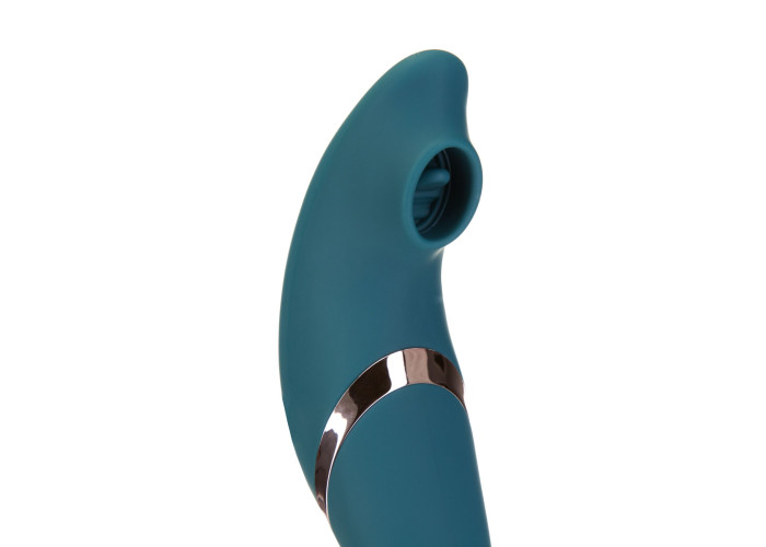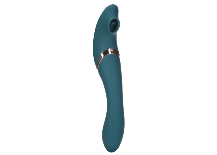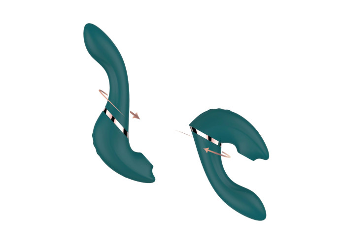 у розігнутому вигляді іграшка перетворюється на двосторонню: з одного боку — вібратор, з іншого — вакуумний стимулятор із язичком;