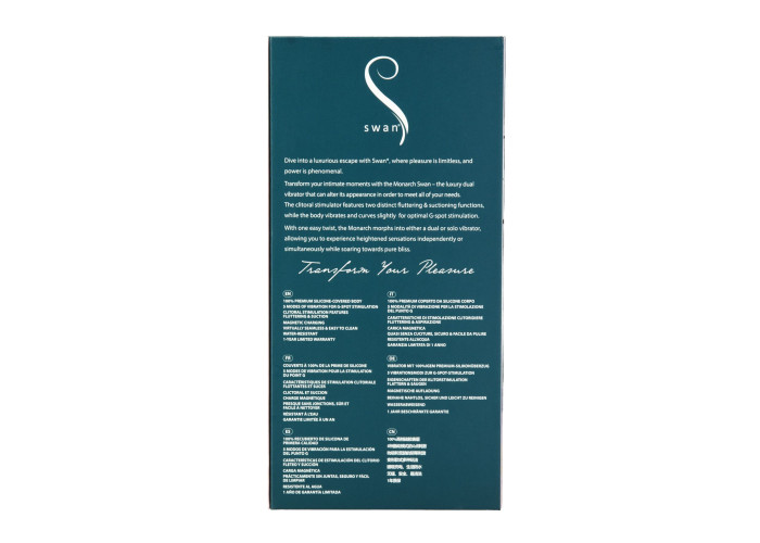 Багатофункціональний вібратор з вакуумною стимуляцією Swan The Monarch подарує таке задоволення, яке не в змозі подарувати ні людина, ні будь-яка інша іграшка. У ньому поєднується революційний дизайн та зручний механізм трансформації. Вібрація, вакуум та неповторні пестощі справжнім язичком — це справжня мрія! Втільте з ним найпотаємніші фантазії! Запакований у розкішну коробку преміального рівня, що робить його чудовим варіантом подарунка, який точно порадує жінку та запам’ятається надовго.