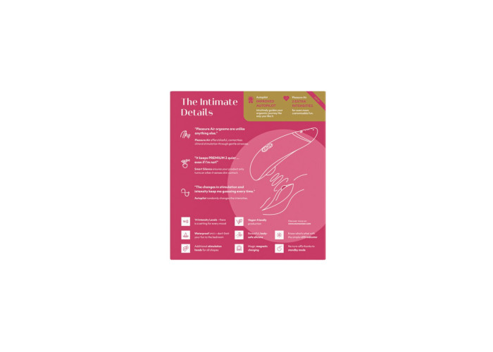 Ще краще, ніж розкішний вуманайзер Premium! Більше функцій, більше рівнів інтенсивності, змінні насадки та сучасний дизайн — це не просто вакуумний стимулятор, це мрія, що стала реальністю. Пропонуємо купити вакуумний кліторальний стимулятор Womanizer Premium 2. У ньому не лише оновлено режим Автопілот (автоматичне перемикання режимів), а й додано технологію Smart Silence, яка забезпечує тиху роботу та автоматичне ввімкнення тільки під час контакту з тілом. Звичайно ж, стимулятор працює із запатентованою технологією Pleasure Air для безконтактної стимуляції клітора. Доступно цілих 14 рівнів інтенсивності впливу! Так, ви точно підлаштуєте стимулятор під ваші бажання. Повністю водонепроникний, цей стимулятор працюватиме до 4 годин на одному заряді — це дійсно унікальна іграшка.