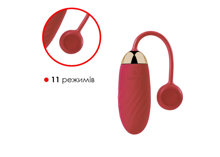 Нові технології вібрації, просте керування, потужний мотор з 11 режимами роботи, шикарні матеріали та продуманий дизайн — усе це ви отримаєте, якщо вирішите купити віброяйце Svakom Ella Red. Цей вібратор відкриє нові горизонти задоволень, а просте керування через смартфон дасть змогу не відволікатися в процесі. Віброяйце Svakom тихе та компактне, стане вашим улюбленим супутником у подорожах, адже цей вібратор можна використовувати і самостійно, і в парі. Віброкуля Сваком відчинить двері у світ яскравих пригод!