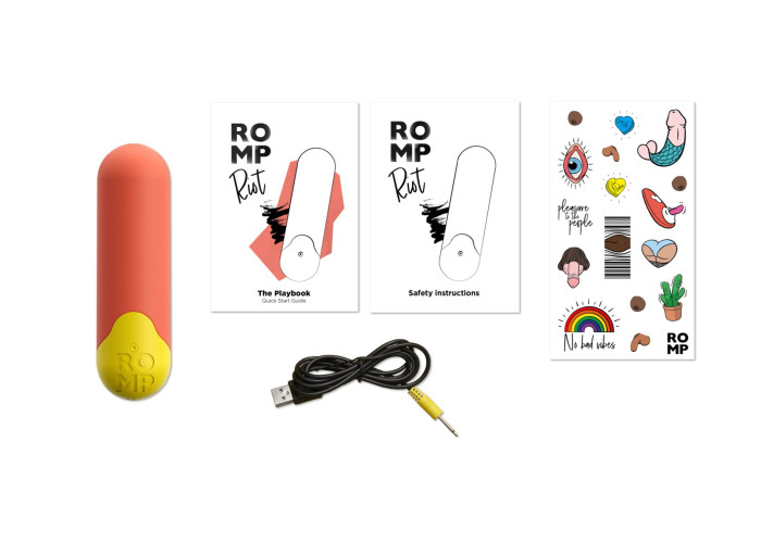 Комплектація: віброкуля Romp Riot, USB-кабель для заряджання, короткий посібник та інструкції з безпеки.