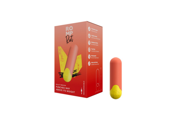 Віброкуля Romp Riot — це стильна манюня, яка попри свій невеликий розмір здатна на багато чого! Ультракомпактна та потужна іграшка за допомогою всього однієї кнопки ніби оживає в руках, а завдяки 4 віброрежимам та 6 рівням інтенсивності потрапляє в найголовнішу мету — дарує яскраві оргазми та море задоволення! Ви також можете використовувати віброкулю, щоб підігріти атмосферу вечора й зануритися в ніжну прелюдію — лише торкайтеся іграшкою до сосків або ж ерогенних зон партнера.
