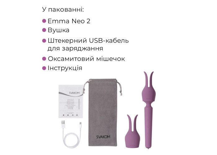 Інтерактивний вібромасажер із підігрівом Svakom Emma Neo 2 — це наступне покоління подібних масажерів. Його можна використовувати як для масажу будь-яких зон та зняття напруження з м’язів, так і для збуджувальної стимуляції ерогенних зон. Насадка-вушка ще більше розширює можливості, адже їх можна вводити всередину!