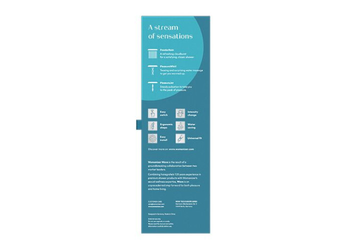 Womanizer Wave – це перший у світі пристрій, що перетворює потоки води на повноцінний масажер. Спільна робота експертів у сфері сантехнічного обладнання hansgrohe та Womanizer. Wave пристрій 2 в 1, який можна використовувати як звичайну насадку для душу, так і стимулятора. 3 режими роботи забезпечують різноманітність відчуттів від струменів води. PleasureJet і PleasureWhirl створені спеціально для стимуляції, а режим PowderRain для звичайного використання насадки як лійка для душу. Простий в керуванні Wave оснащений 1 кнопкою для зміни режимів та 1 "повзунком" для регулювання напору води. Також лійка дозволяє економити до 60% води.