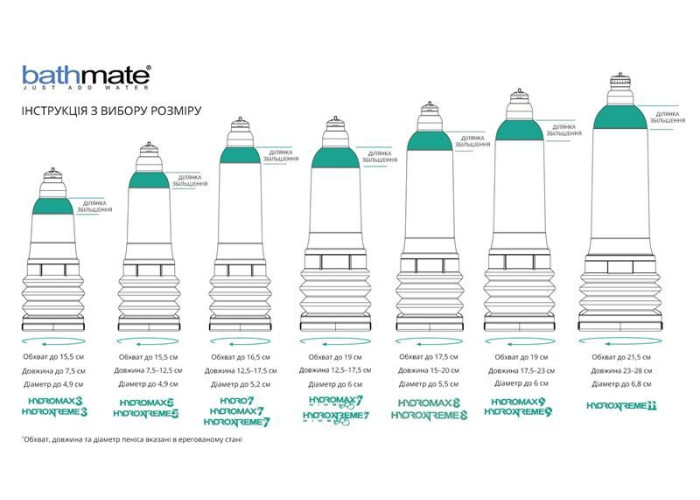 Тепер у арсеналі Bathmate є гідропомпи для будь-яких розмірів члена - маленькі Hydromax 5, середні Hydromax 7, великі Hydromax 9, екстра великі HYDROXTREME 11 і тепер середня по довжині і велика у діаметрі HYDROMAX 7 Wide Boy