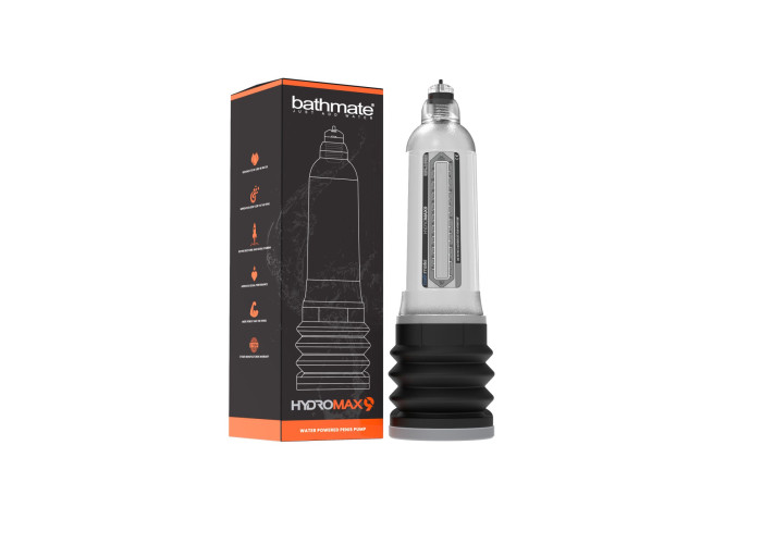 Bathmate HYDROMAX 9 - це унікальна гідропомпа з нової серії Hydromax, які на 35% ефективніше і на 15% більше Bathmate HYDRO 7. Помпа HYDROMAX 9 має таку ж конструкцію з HYDROMAX 7 і відрізняється тільки розміром. Вона також оснащена клапаном з функцією блокування, можливістю повертати колбу щодо гофри і силіконової підкладкою для зручності використання.