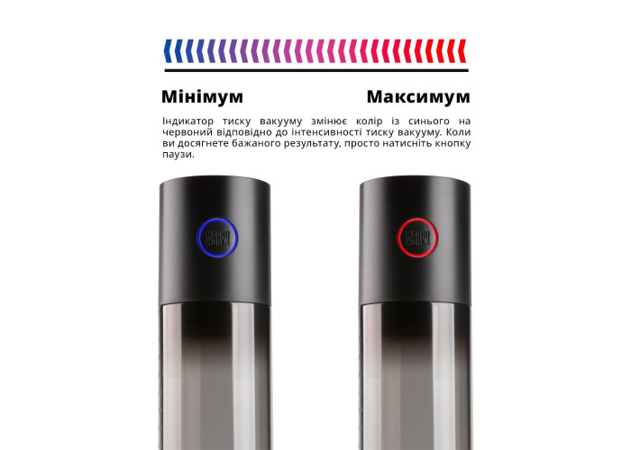 Автоматична вакуумна помпа Otouch MACHO WORK 1 працює за принципом безступеневого вакууму, що означає відсутність попередньо встановлених рівнів вакууму та дає змогу ідеально дібрати тиск саме для вас. Вакуум плавно наростає, і коли він досягне потрібного рівня, ви можете просто натиснути кнопку керування і зафіксувати відповідний для вас тиск. Запам’ятайте колір LED-індикатора, щоб повернутися до улюбленого впливу в будь-який час!