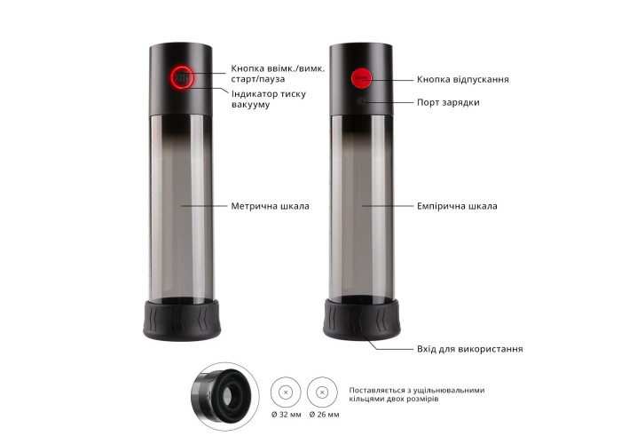 у комплекті — два ущільнювальні кільця з приємного на дотик пружного силікону, який щільно охоплює член, внутрішні діаметри кілець 2,6 та 3,6 см, добре розтягується до стінок помпи;