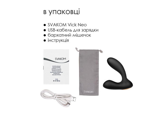 У пакованні: SVAKOM Vick Neo + оксамитовий мішечок + інструкція + USB-кабель для заряджання.