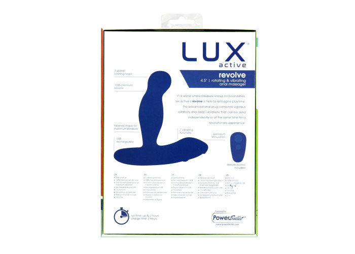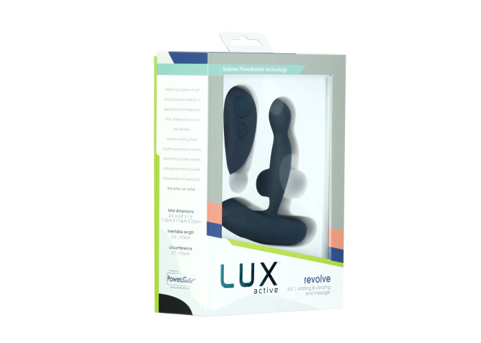 Глибокий масаж простати головкою, що обертається, плюс стимуляція промежини вібрувальною основою — те, що потрібно для максимального задоволення! Пропонуємо купити масажер простати з ротацією та вібрацією Lux Active Revolve поліпшеного обтічного дизайну для легкого введення. Округла гладенька головка обертається на 3 швидкостях, ніжно або інтенсивно масажуючи точку Р, водночас широка основа вібрує в 7 режимах, щоб додати приємних відчуттів. Мотори можуть працювати і разом, і по одному. У комплекті — пульт керування для комфортного використання.