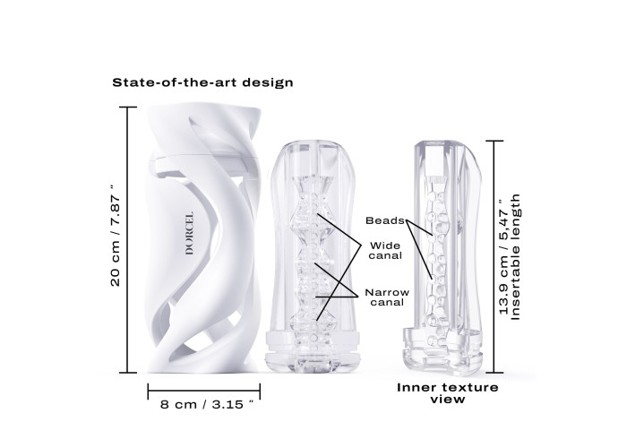 декілька зон стимуляції всередині рукава: ваш член зустрічають ніжні опуклості, у середині його фантастично охоплюють спіралі, потім щільні перлини стимулюють кожну чутливу точку, а у фіналі канал звужується для супер’яскравих відчуттів;