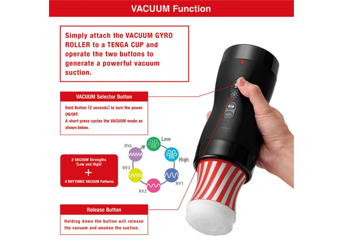 Tenga VACUUM GYRO ROLLER підіймає насолоду на абсолютно новий рівень! Посмоктування та рухи по колу на потрібній швидкості та з потрібною інтенсивністю — ідеальний релакс.