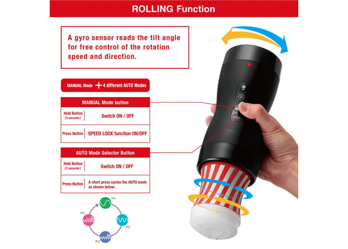 Перетворіть усі свої мастурбатори Tenga Cup на автоматичні! Ротація плюс вакуум: усього кілька натискань кнопок — і ви отримуєте максимальну насолоду. Зручний лаконічний корпус із пластику легко вміщує будь-який мастурбатор Tenga Cup, крім того, до комплекту вже входить Rolling Tenga Cup. Автоматичний мастурбатор має 4 швидкості ротації, 6 режимів вакууму плюс автоматичний режим. Поєднуйте їх або вмикайте почергово — усе для вашого задоволення! Разом із мастурбатором ви отримаєте також мініатюру лубриканта на водній основі.