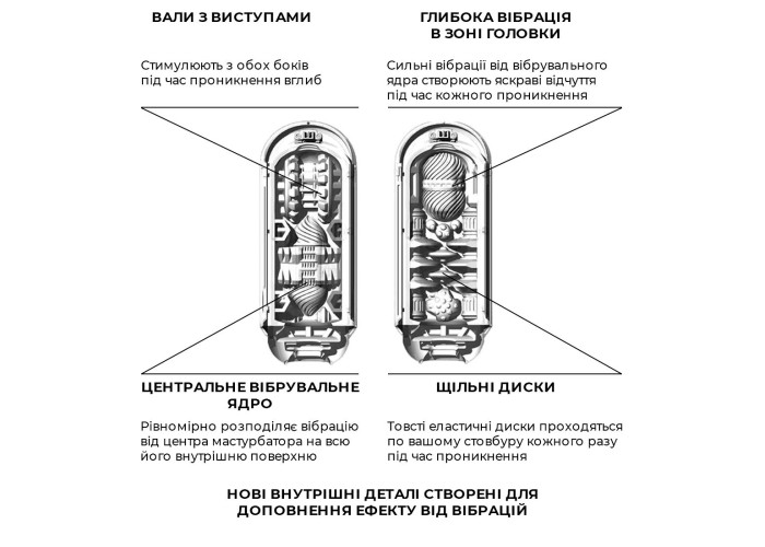 унікальний рельєф щільних жорстких стінок рукава забезпечує більшу інтенсивність стимуляції під час рухів пеніса, а нові внутрішні деталі призначені для доповнення ефекту від вібрацій;