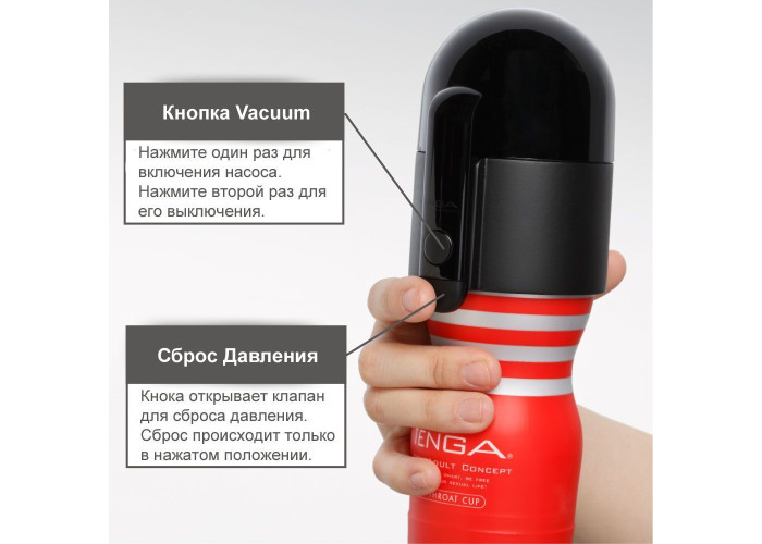 Щоб користуватися Vacuum Controller, видаліть наклейку з верхньої частини мастурбатора, оголюючи вакуумний отвір. Прикріпіть відповідний адаптер до верхньої частини Tenga та прикріпіть блок контролера. Натисніть на кнопку, щоб увімкнути насос і створити вакуум. Відчуваєте, як Tenga всмоктує ваш член? Для того щоб послабити всмоктування, натисніть другу кнопку контролера. Чергуючи всмоктування та послаблення ви можете керувати вашим мастурбатором Тenga так, щоб імітувати справжній оральний секс!