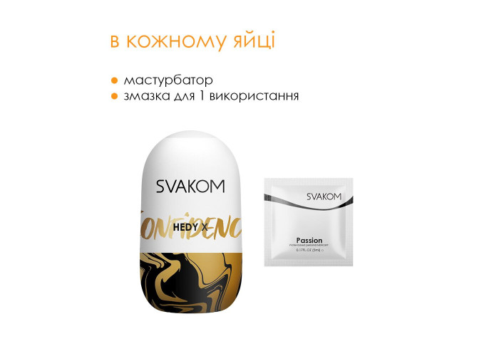 Відразу 5 унікальних мастурбаторів в одному наборі — це практично невичерпне джерело насолоди! Якщо ви шукаєте нові враження у зручному форматі, рекомендуємо купити набір яєць мастурбаторів Svakom Hedy X Confidence. Щільні сегменти усередині яйця стимулюватиме кожен міліметр пеніса, приводячи вас до вершин задоволення. Яйце можна використовувати й навиворіт, якщо хочеться ніжнішого впливу: у кожного мастурбатора унікальна і внутрішня, і зовнішня сторона. З кожним яйцем у комплекті лубрикант!