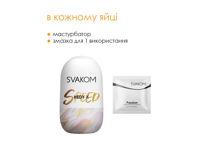 Відразу 5 унікальних мастурбаторів в одному наборі — це практично невичерпне джерело насолоди! Якщо ви шукаєте нові враження у зручному форматі, рекомендуємо купити набір яєць мастурбаторів Svakom Hedy X Speed. Ніжні хвилі усередині яйця стимулюватиме кожен міліметр пеніса, приводячи вас до вершин задоволення. Яйце можна використовувати й навиворіт, якщо хочеться ніжнішого впливу: у кожного мастурбатора унікальна і внутрішня, і зовнішня сторона. З кожним яйцем у комплекті лубрикант!