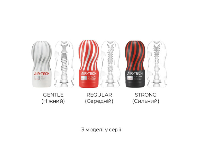 Tenga Air-Tech представлений у трьох варіантах, які забезпечують різний рівень стимуляції: GENTLE — м’які реберця ніжно лоскочуть і дражнять; REGULAR — численні вузли та більші горбки забезпечують класичну стимуляцію; STRONG — жорсткі гребені та ребра, вузький тунель для потужної, сильно відчутної стимуляції.