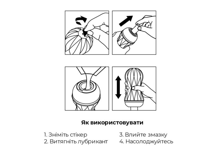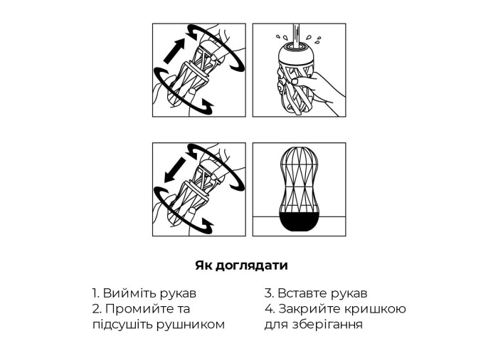Доглядати за цим багаторазовим мастурбатором дуже просто, оскільки рукав виймається. Вам достатньо промити його під проточною водою з нейтральним милом та/або дезінфікувальним засобом для іграшок, витерти безворсовим рушником, дати висохнути і встановити рукав у корпус. Найлегше вставляти рукав обертаючи.