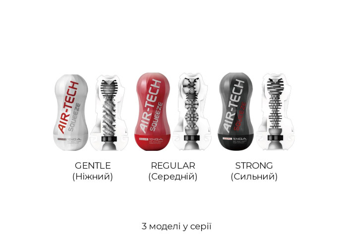 Tenga Air-Tech Squeeze представлений у трьох варіантах, які забезпечують різний рівень стимуляції: GENTLE — дарує ніжні обволікальні відчуття; REGULAR — забезпечує стимуляцію класичної сили; STRONG — гарантує максимально яскравий вплив щільного та досить жорсткого матеріалу.