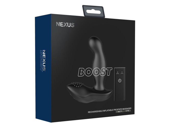Вібромасажер простати з надувною головкою Nexus Boost постачається з перезаряджуваним і водонепроникним пультом дистанційного керування. Для заряджання під’єднується до ПК або розетки.