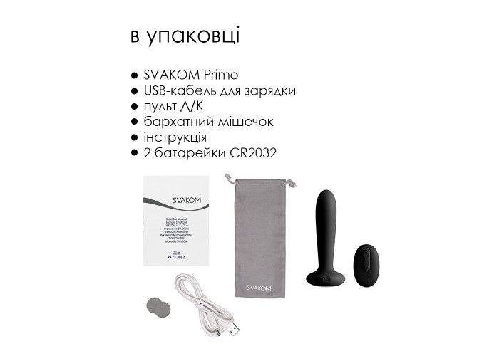 В упаковці: SVAKOM Primo + пульт Д/У + оксамитовий мішечок + інструкція + кабель USB для зарядки + 2 батарейки CR2032.