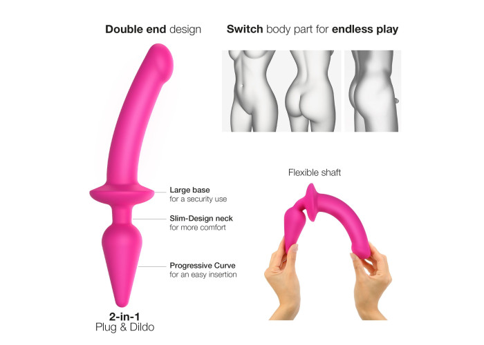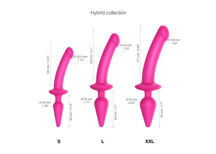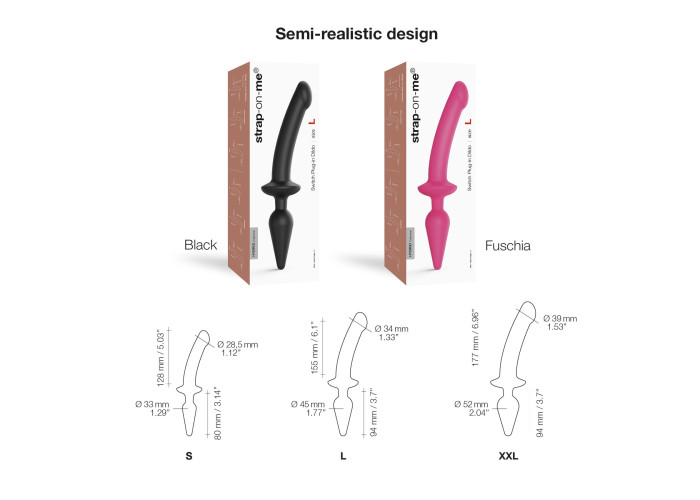 Колекція Strap-On-Me Switch (у перекладі — перемикач) дає змогу перемикати та поєднувати задоволення. Представлені у двох варіантах форми (реалістичної та напівреалістичної), дилдо забезпечують також і різноманітність у розмірах: від мініатюрного варіанту S до гіганта XXL. Анальні пробки також відрізняються за розміром. Різні діаметри, форми та фактури підкорюють новими відчуттями, більш інтенсивними та несподіваними. Доберіть оптимальну форму та розмір і швидше вирушайте в наповнений сексуальними експериментами світ надзвичайних оргазмів.