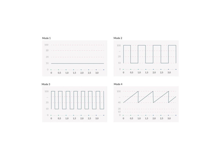 5 патернів електростимуляції: рівномірні поколювання, поколювання з чергуванням інтенсивності, рівномірна пульсація (імпульсний струм), пульсація різної інтенсивності, чергування поколювання та пульсації;