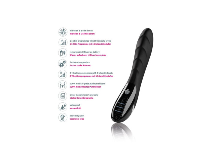 подача електроімпульса у стовбур вібратора, передбачено 5 програм електростимуляції і 10 рівнів інтенсивності імпульсу, працює без додаткових пристроїв і проводів!