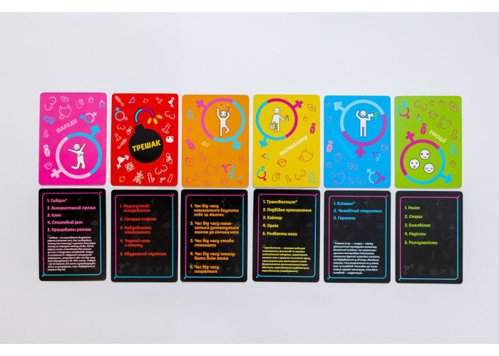 Правила: Учасники діляться на команди. Гравець для вибору завдання кидає кубик і тягне карту з тієї стопки карт, яка відповідає межі на кубику. Завдання можуть бути - пояснити, намалювати, або показати те, що зазначено на карті. Далі команда повинна вгадати, що показує, малює або пояснює їх гравець. Все це приправлено відіграванням певних емоцій і дій.